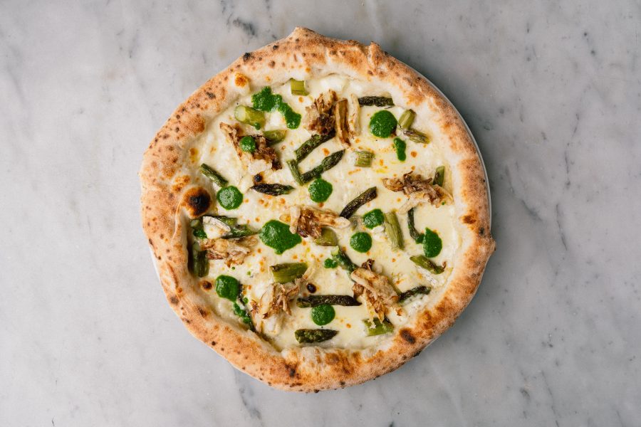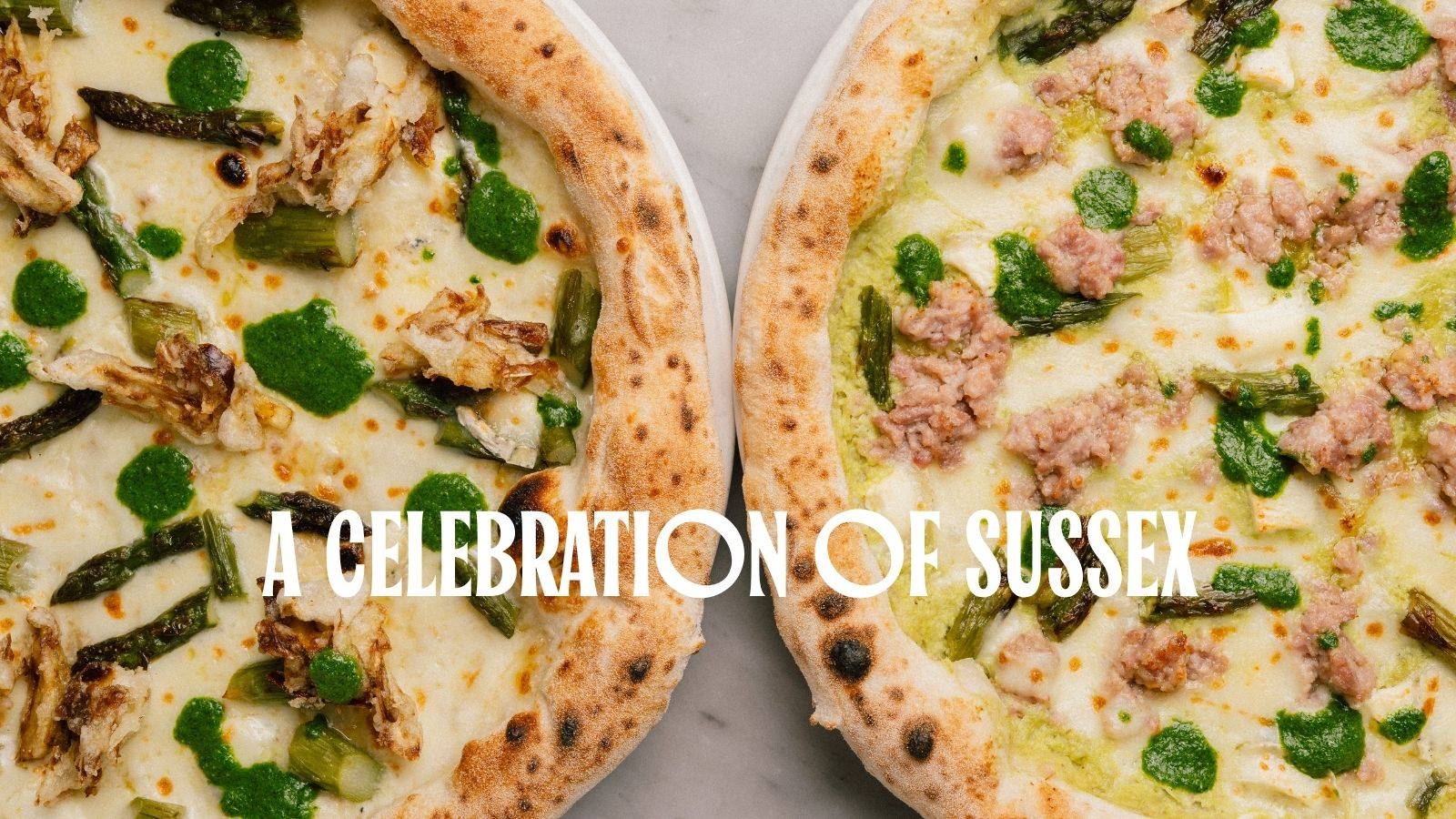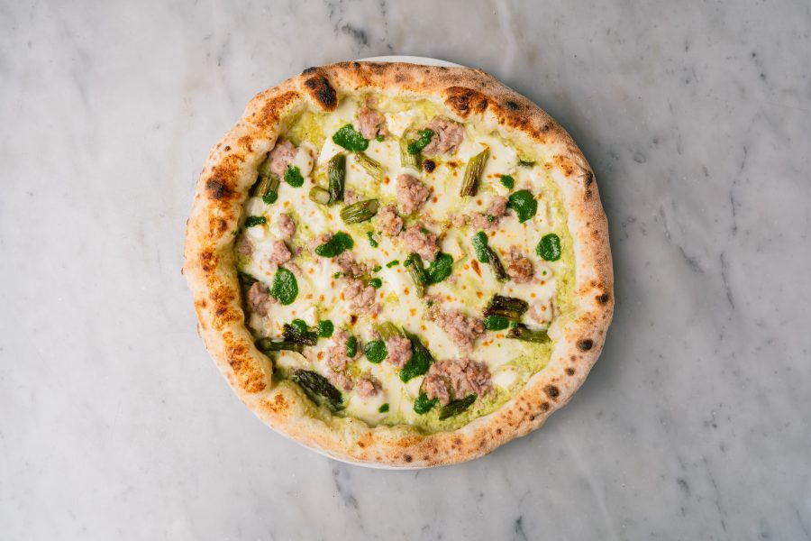 Barfield’s Sussex Sausage, Golden Cross Goat’s Cheese, wild garlic pesto, crema di fave (broadbean cream), asparagus, mozzarella, parmesan